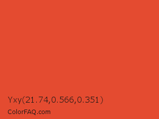 Yxy 21.74,0.566,0.351 Color is a normal red color and the nearest color is Cinnabar #e34234. Hex code #e44b30 and RGB value is rgb(228,75,48). In RGB color space, this color is composed of 89% red, 29% green, 19% blue, In CMYK color space, this color is composed of 0% cyan, 67% magenta, 79% yellow , 11% black , In HSL color space, this color has a hue angle of 9° , 77% saturation and 54% lightness.