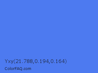 Yxy 21.788,0.194,0.164 Color is a light blue color and the nearest color is Blueberry #4f86f7. Hex code #4d7af0 and RGB value is rgb(77,122,240). In RGB color space, this color is composed of 30% red, 48% green, 94% blue, In CMYK color space, this color is composed of 68% cyan, 49% magenta, 0% yellow , 6% black , In HSL color space, this color has a hue angle of 223° , 84% saturation and 62% lightness.