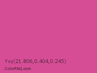 Yxy 21.806,0.404,0.245 Color is a normal rose color and the nearest color is Pink Pantone #d74894. Hex code #d64d96 and RGB value is rgb(214,77,150). In RGB color space, this color is composed of 84% red, 30% green, 59% blue, In CMYK color space, this color is composed of 0% cyan, 64% magenta, 30% yellow , 16% black , In HSL color space, this color has a hue angle of 328° , 63% saturation and 57% lightness.