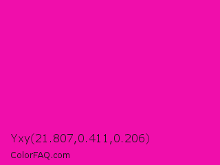Yxy 21.807,0.411,0.206 Color is a normal magenta color and the nearest color is Hollywood Cerise #f400a1. Hex code #f00eab and RGB value is rgb(240,14,171). In RGB color space, this color is composed of 94% red, 5% green, 67% blue, In CMYK color space, this color is composed of 0% cyan, 94% magenta, 29% yellow , 6% black , In HSL color space, this color has a hue angle of 318° , 89% saturation and 50% lightness.