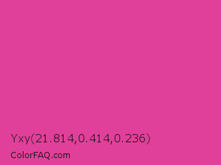 Yxy 21.814,0.414,0.236 Color is a normal magenta color and the nearest color is Pink Pantone #d74894. Hex code #e04099 and RGB value is rgb(224,64,153). In RGB color space, this color is composed of 88% red, 25% green, 60% blue, In CMYK color space, this color is composed of 0% cyan, 71% magenta, 32% yellow , 12% black , In HSL color space, this color has a hue angle of 327° , 72% saturation and 56% lightness.