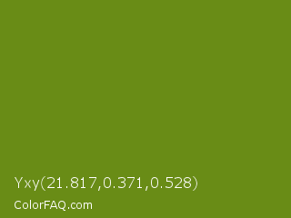 Yxy 21.817,0.371,0.528 Color is a normal lime color and the nearest color is Olive Drab #6b8e23. Hex code #698c16 and RGB value is rgb(105,140,22). In RGB color space, this color is composed of 41% red, 55% green, 9% blue, In CMYK color space, this color is composed of 25% cyan, 0% magenta, 84% yellow , 45% black , In HSL color space, this color has a hue angle of 78° , 73% saturation and 32% lightness.