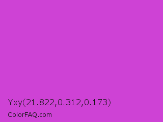 Yxy 21.822,0.312,0.173 Color is a normal magenta color and the nearest color is Steel Pink #cc33cc. Hex code #ce42d5 and RGB value is rgb(206,66,213). In RGB color space, this color is composed of 81% red, 26% green, 84% blue, In CMYK color space, this color is composed of 3% cyan, 69% magenta, 0% yellow , 16% black , In HSL color space, this color has a hue angle of 297° , 64% saturation and 55% lightness.