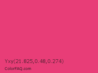 Yxy 21.825,0.48,0.274 Color is a normal rose color and the nearest color is Cerise Pink #ec3b83. Hex code #e83d77 and RGB value is rgb(232,61,119). In RGB color space, this color is composed of 91% red, 24% green, 47% blue, In CMYK color space, this color is composed of 0% cyan, 74% magenta, 49% yellow , 9% black , In HSL color space, this color has a hue angle of 340° , 79% saturation and 57% lightness.