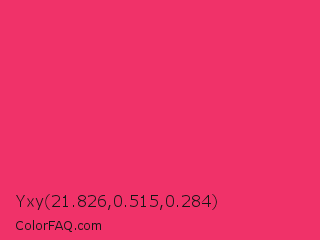 Yxy 21.826,0.515,0.284 Color is a normal rose color and the nearest color is Paradise Pink #e63e62. Hex code #f03269 and RGB value is rgb(240,50,105). In RGB color space, this color is composed of 94% red, 20% green, 41% blue, In CMYK color space, this color is composed of 0% cyan, 79% magenta, 56% yellow , 6% black , In HSL color space, this color has a hue angle of 343° , 86% saturation and 57% lightness.