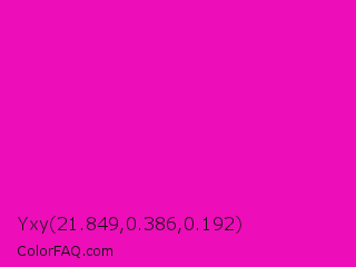 Yxy 21.849,0.386,0.192 Color is a normal magenta color and the nearest color is Shocking Pink #fc0fc0. Hex code #ed0db9 and RGB value is rgb(237,13,185). In RGB color space, this color is composed of 93% red, 5% green, 73% blue, In CMYK color space, this color is composed of 0% cyan, 95% magenta, 22% yellow , 7% black , In HSL color space, this color has a hue angle of 314° , 90% saturation and 49% lightness.
