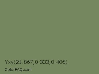 Yxy 21.867,0.333,0.406 Color is a normal green color and the nearest color is Highland #6f8e63. Hex code #74875f and RGB value is rgb(116,135,95). In RGB color space, this color is composed of 45% red, 53% green, 37% blue, In CMYK color space, this color is composed of 14% cyan, 0% magenta, 30% yellow , 47% black , In HSL color space, this color has a hue angle of 89° , 17% saturation and 45% lightness.