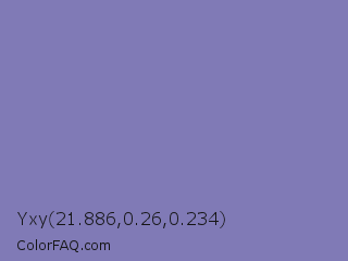 Yxy 21.886,0.26,0.234 Color is a normal indigo color and the nearest color is Ube #8878c3. Hex code #807ab6 and RGB value is rgb(128,122,182). In RGB color space, this color is composed of 50% red, 48% green, 71% blue, In CMYK color space, this color is composed of 30% cyan, 33% magenta, 0% yellow , 29% black , In HSL color space, this color has a hue angle of 246° , 29% saturation and 60% lightness.