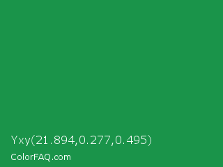 Yxy 21.894,0.277,0.495 Color is a normal green color and the nearest color is Eucalyptus #278a5b. Hex code #1a944a and RGB value is rgb(26,148,74). In RGB color space, this color is composed of 10% red, 58% green, 29% blue, In CMYK color space, this color is composed of 82% cyan, 0% magenta, 50% yellow , 42% black , In HSL color space, this color has a hue angle of 144° , 70% saturation and 34% lightness.