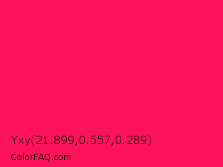 Yxy 21.899,0.557,0.289 Color is a normal rose color and the nearest color is Awesome #ff2052. Hex code #fc135a and RGB value is rgb(252,19,90). In RGB color space, this color is composed of 99% red, 7% green, 35% blue, In CMYK color space, this color is composed of 0% cyan, 92% magenta, 64% yellow , 1% black , In HSL color space, this color has a hue angle of 342° , 97% saturation and 53% lightness.