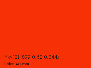 Yxy 21.899,0.62,0.344 Color is a normal red color and the nearest color is Coquelicot #ff3800. Hex code #f73005 and RGB value is rgb(247,48,5). In RGB color space, this color is composed of 97% red, 19% green, 2% blue, In CMYK color space, this color is composed of 0% cyan, 81% magenta, 98% yellow , 3% black , In HSL color space, this color has a hue angle of 11° , 96% saturation and 49% lightness.
