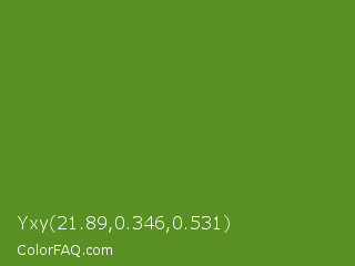 Yxy 21.89,0.346,0.531 Color is a normal green color and the nearest color is Vida Loca #549019. Hex code #598f23 and RGB value is rgb(89,143,35). In RGB color space, this color is composed of 35% red, 56% green, 14% blue, In CMYK color space, this color is composed of 38% cyan, 0% magenta, 76% yellow , 44% black , In HSL color space, this color has a hue angle of 90° , 61% saturation and 35% lightness.