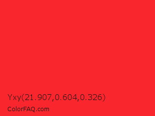 Yxy 21.907,0.604,0.326 Color is a normal red color and the nearest color is Imperial Red #ed2939. Hex code #fa262e and RGB value is rgb(250,38,46). In RGB color space, this color is composed of 98% red, 15% green, 18% blue, In CMYK color space, this color is composed of 0% cyan, 85% magenta, 82% yellow , 2% black , In HSL color space, this color has a hue angle of 358° , 95% saturation and 56% lightness.