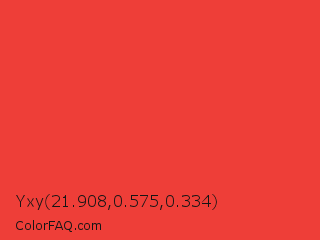 Yxy 21.908,0.575,0.334 Color is a normal red color and the nearest color is Cinnabar #e34234. Hex code #ee3e38 and RGB value is rgb(238,62,56). In RGB color space, this color is composed of 93% red, 24% green, 22% blue, In CMYK color space, this color is composed of 0% cyan, 74% magenta, 76% yellow , 7% black , In HSL color space, this color has a hue angle of 2° , 84% saturation and 58% lightness.