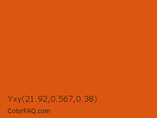 Yxy 21.92,0.567,0.38 Color is a normal orange color and the nearest color is Bamboo #da6304. Hex code #db5711 and RGB value is rgb(219,87,17). In RGB color space, this color is composed of 86% red, 34% green, 7% blue, In CMYK color space, this color is composed of 0% cyan, 60% magenta, 92% yellow , 14% black , In HSL color space, this color has a hue angle of 21° , 86% saturation and 46% lightness.