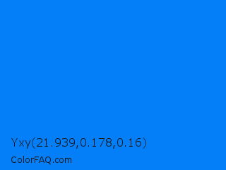 Yxy 21.939,0.178,0.16 Color is a normal blue color and the nearest color is Azure Radiance #007fff. Hex code #047ff7 and RGB value is rgb(4,127,247). In RGB color space, this color is composed of 2% red, 50% green, 97% blue, In CMYK color space, this color is composed of 98% cyan, 49% magenta, 0% yellow , 3% black , In HSL color space, this color has a hue angle of 210° , 97% saturation and 49% lightness.