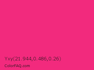 Yxy 21.944,0.486,0.26 Color is a normal rose color and the nearest color is Cerise Pink #ec3b83. Hex code #f22a7d and RGB value is rgb(242,42,125). In RGB color space, this color is composed of 95% red, 16% green, 49% blue, In CMYK color space, this color is composed of 0% cyan, 83% magenta, 48% yellow , 5% black , In HSL color space, this color has a hue angle of 335° , 88% saturation and 56% lightness.
