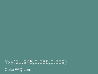 Yxy 21.945,0.268,0.339 Color is a normal cyan color and the nearest color is Wintergreen Dream #56887d. Hex code #588a85 and RGB value is rgb(88,138,133). In RGB color space, this color is composed of 35% red, 54% green, 52% blue, In CMYK color space, this color is composed of 36% cyan, 0% magenta, 4% yellow , 46% black , In HSL color space, this color has a hue angle of 174° , 22% saturation and 44% lightness.