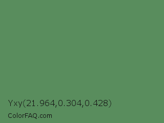 Yxy 21.964,0.304,0.428 Color is a normal green color and the nearest color is Spring Leaves #578363. Hex code #598d5d and RGB value is rgb(89,141,93). In RGB color space, this color is composed of 35% red, 55% green, 36% blue, In CMYK color space, this color is composed of 37% cyan, 0% magenta, 34% yellow , 45% black , In HSL color space, this color has a hue angle of 125° , 23% saturation and 45% lightness.