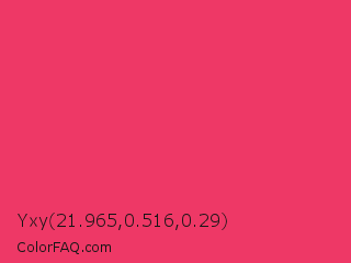 Yxy 21.965,0.516,0.29 Color is a normal red color and the nearest color is Paradise Pink #e63e62. Hex code #ee3866 and RGB value is rgb(238,56,102). In RGB color space, this color is composed of 93% red, 22% green, 40% blue, In CMYK color space, this color is composed of 0% cyan, 76% magenta, 57% yellow , 7% black , In HSL color space, this color has a hue angle of 345° , 84% saturation and 58% lightness.
