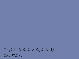 Yxy 21.966,0.255,0.254 Color is a normal blue color and the nearest color is Shadow Blue #778ba5. Hex code #7180ad and RGB value is rgb(113,128,173). In RGB color space, this color is composed of 44% red, 50% green, 68% blue, In CMYK color space, this color is composed of 35% cyan, 26% magenta, 0% yellow , 32% black , In HSL color space, this color has a hue angle of 225° , 27% saturation and 56% lightness.