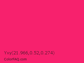 Yxy 21.966,0.52,0.274 Color is a normal rose color and the nearest color is Razzmatazz #e3256b. Hex code #f7216d and RGB value is rgb(247,33,109). In RGB color space, this color is composed of 97% red, 13% green, 43% blue, In CMYK color space, this color is composed of 0% cyan, 87% magenta, 56% yellow , 3% black , In HSL color space, this color has a hue angle of 339° , 93% saturation and 55% lightness.