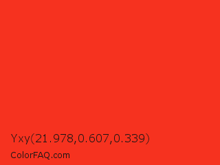 Yxy 21.978,0.607,0.339 Color is a normal red color and the nearest color is Red RYB #fe2712. Hex code #f6321f and RGB value is rgb(246,50,31). In RGB color space, this color is composed of 96% red, 20% green, 12% blue, In CMYK color space, this color is composed of 0% cyan, 80% magenta, 87% yellow , 4% black , In HSL color space, this color has a hue angle of 5° , 92% saturation and 54% lightness.