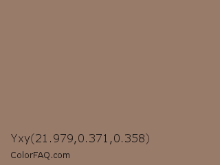 Yxy 21.979,0.371,0.358 Color is a normal orange color and the nearest color is Beaver #9f8170. Hex code #997b6a and RGB value is rgb(153,123,106). In RGB color space, this color is composed of 60% red, 48% green, 42% blue, In CMYK color space, this color is composed of 0% cyan, 20% magenta, 31% yellow , 40% black , In HSL color space, this color has a hue angle of 22° , 19% saturation and 51% lightness.