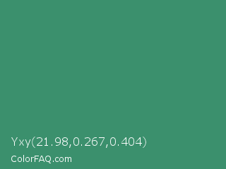 Yxy 21.98,0.267,0.404 Color is a normal green color and the nearest color is Illuminating Emerald #319177. Hex code #3b906d and RGB value is rgb(59,144,109). In RGB color space, this color is composed of 23% red, 56% green, 43% blue, In CMYK color space, this color is composed of 59% cyan, 0% magenta, 24% yellow , 44% black , In HSL color space, this color has a hue angle of 155° , 42% saturation and 40% lightness.
