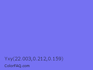 Yxy 22.003,0.212,0.159 Color is a light indigo color and the nearest color is Medium Slate Blue #7b68ee. Hex code #7571f2 and RGB value is rgb(117,113,242). In RGB color space, this color is composed of 46% red, 44% green, 95% blue, In CMYK color space, this color is composed of 52% cyan, 53% magenta, 0% yellow , 5% black , In HSL color space, this color has a hue angle of 242° , 83% saturation and 70% lightness.