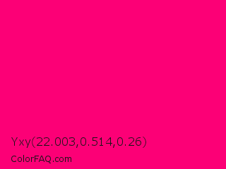 Yxy 22.003,0.514,0.26 Color is a normal rose color and the nearest color is Winter Sky #ff007c. Hex code #fc0076 and RGB value is rgb(252,0,118). In RGB color space, this color is composed of 99% red, 0% green, 46% blue, In CMYK color space, this color is composed of 0% cyan, 100% magenta, 53% yellow , 1% black , In HSL color space, this color has a hue angle of 332° , 100% saturation and 49% lightness.