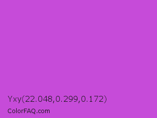 Yxy 22.048,0.299,0.172 Color is a normal magenta color and the nearest color is Medium Orchid #ba55d3. Hex code #c64bd9 and RGB value is rgb(198,75,217). In RGB color space, this color is composed of 78% red, 29% green, 85% blue, In CMYK color space, this color is composed of 9% cyan, 65% magenta, 0% yellow , 15% black , In HSL color space, this color has a hue angle of 292° , 65% saturation and 57% lightness.
