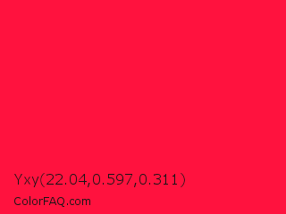 Yxy 22.04,0.597,0.311 Color is a normal red color and the nearest color is Torch Red #fd0e35. Hex code #ff123e and RGB value is rgb(255,18,62). In RGB color space, this color is composed of 100% red, 7% green, 24% blue, In CMYK color space, this color is composed of 0% cyan, 93% magenta, 76% yellow , 0% black , In HSL color space, this color has a hue angle of 349° , 100% saturation and 54% lightness.