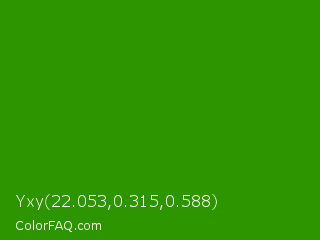 Yxy 22.053,0.315,0.588 Color is a dark green color and the nearest color is Napier Green #2a8000. Hex code #2c9500 and RGB value is rgb(44,149,0). In RGB color space, this color is composed of 17% red, 58% green, 0% blue, In CMYK color space, this color is composed of 70% cyan, 0% magenta, 100% yellow , 42% black , In HSL color space, this color has a hue angle of 102° , 100% saturation and 29% lightness.