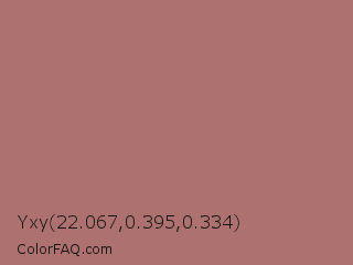Yxy 22.067,0.395,0.334 Color is a normal red color and the nearest color is Copper Penny #ad6f69. Hex code #ad726f and RGB value is rgb(173,114,111). In RGB color space, this color is composed of 68% red, 45% green, 44% blue, In CMYK color space, this color is composed of 0% cyan, 34% magenta, 36% yellow , 32% black , In HSL color space, this color has a hue angle of 3° , 27% saturation and 56% lightness.