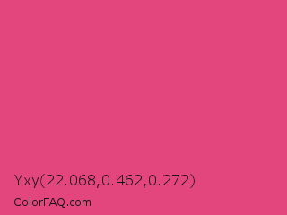 Yxy 22.068,0.462,0.272 Color is a normal rose color and the nearest color is Cranberry #db5079. Hex code #e3457d and RGB value is rgb(227,69,125). In RGB color space, this color is composed of 89% red, 27% green, 49% blue, In CMYK color space, this color is composed of 0% cyan, 70% magenta, 45% yellow , 11% black , In HSL color space, this color has a hue angle of 339° , 74% saturation and 58% lightness.