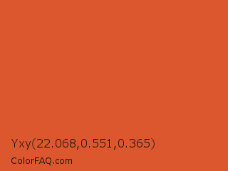 Yxy 22.068,0.551,0.365 Color is a normal red color and the nearest color is Flame Pea #da5b38. Hex code #dc562e and RGB value is rgb(220,86,46). In RGB color space, this color is composed of 86% red, 34% green, 18% blue, In CMYK color space, this color is composed of 0% cyan, 61% magenta, 79% yellow , 14% black , In HSL color space, this color has a hue angle of 14° , 71% saturation and 52% lightness.