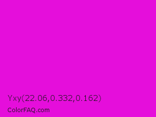 Yxy 22.06,0.332,0.162 Color is a normal magenta color and the nearest color is Deep Magenta #cc00cc. Hex code #e50edb and RGB value is rgb(229,14,219). In RGB color space, this color is composed of 90% red, 5% green, 86% blue, In CMYK color space, this color is composed of 0% cyan, 94% magenta, 4% yellow , 10% black , In HSL color space, this color has a hue angle of 303° , 88% saturation and 48% lightness.