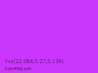 Yxy 22.084,0.27,0.139 Color is a normal purple color and the nearest color is Veronica #a020f0. Hex code #c936fc and RGB value is rgb(201,54,252). In RGB color space, this color is composed of 79% red, 21% green, 99% blue, In CMYK color space, this color is composed of 20% cyan, 79% magenta, 0% yellow , 1% black , In HSL color space, this color has a hue angle of 285° , 97% saturation and 60% lightness.