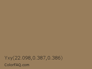 Yxy 22.098,0.387,0.386 Color is a normal orange color and the nearest color is Chamoisee #a0785a. Hex code #987d5b and RGB value is rgb(152,125,91). In RGB color space, this color is composed of 60% red, 49% green, 36% blue, In CMYK color space, this color is composed of 0% cyan, 18% magenta, 40% yellow , 40% black , In HSL color space, this color has a hue angle of 33° , 25% saturation and 48% lightness.