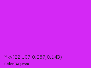 Yxy 22.107,0.287,0.143 Color is a normal purple color and the nearest color is Vivid Orchid #cc00ff. Hex code #d428f5 and RGB value is rgb(212,40,245). In RGB color space, this color is composed of 83% red, 16% green, 96% blue, In CMYK color space, this color is composed of 13% cyan, 84% magenta, 0% yellow , 4% black , In HSL color space, this color has a hue angle of 290° , 91% saturation and 56% lightness.