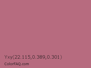Yxy 22.115,0.389,0.301 Color is a normal rose color and the nearest color is Rose Gold #b76e79. Hex code #b76b7f and RGB value is rgb(183,107,127). In RGB color space, this color is composed of 72% red, 42% green, 50% blue, In CMYK color space, this color is composed of 0% cyan, 42% magenta, 31% yellow , 28% black , In HSL color space, this color has a hue angle of 344° , 35% saturation and 57% lightness.