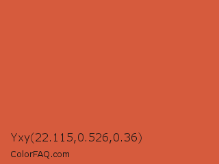 Yxy 22.115,0.526,0.36 Color is a normal red color and the nearest color is Medium Vermilion #d9603b. Hex code #d65b3d and RGB value is rgb(214,91,61). In RGB color space, this color is composed of 84% red, 36% green, 24% blue, In CMYK color space, this color is composed of 0% cyan, 57% magenta, 71% yellow , 16% black , In HSL color space, this color has a hue angle of 12° , 65% saturation and 54% lightness.