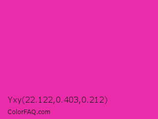 Yxy 22.122,0.403,0.212 Color is a normal magenta color and the nearest color is Frostbite #e936a7. Hex code #ea2baa and RGB value is rgb(234,43,170). In RGB color space, this color is composed of 92% red, 17% green, 67% blue, In CMYK color space, this color is composed of 0% cyan, 82% magenta, 27% yellow , 8% black , In HSL color space, this color has a hue angle of 320° , 82% saturation and 54% lightness.