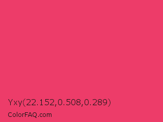 Yxy 22.152,0.508,0.289 Color is a normal red color and the nearest color is Paradise Pink #e63e62. Hex code #ed3c69 and RGB value is rgb(237,60,105). In RGB color space, this color is composed of 93% red, 24% green, 41% blue, In CMYK color space, this color is composed of 0% cyan, 75% magenta, 56% yellow , 7% black , In HSL color space, this color has a hue angle of 345° , 83% saturation and 58% lightness.