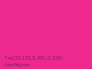 Yxy 22.155,0.451,0.239 Color is a normal rose color and the nearest color is Barbie Pink #e0218a. Hex code #f02991 and RGB value is rgb(240,41,145). In RGB color space, this color is composed of 94% red, 16% green, 57% blue, In CMYK color space, this color is composed of 0% cyan, 83% magenta, 40% yellow , 6% black , In HSL color space, this color has a hue angle of 329° , 87% saturation and 55% lightness.