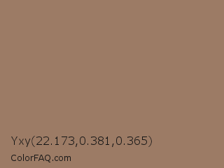 Yxy 22.173,0.381,0.365 Color is a normal orange color and the nearest color is Chamoisee #a0785a. Hex code #9c7b65 and RGB value is rgb(156,123,101). In RGB color space, this color is composed of 61% red, 48% green, 40% blue, In CMYK color space, this color is composed of 0% cyan, 21% magenta, 35% yellow , 39% black , In HSL color space, this color has a hue angle of 24° , 22% saturation and 50% lightness.