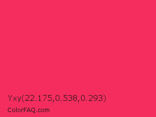Yxy 22.175,0.538,0.293 Color is a normal red color and the nearest color is Radical Red #ff355e. Hex code #f52d5e and RGB value is rgb(245,45,94). In RGB color space, this color is composed of 96% red, 18% green, 37% blue, In CMYK color space, this color is composed of 0% cyan, 82% magenta, 62% yellow , 4% black , In HSL color space, this color has a hue angle of 345° , 91% saturation and 57% lightness.