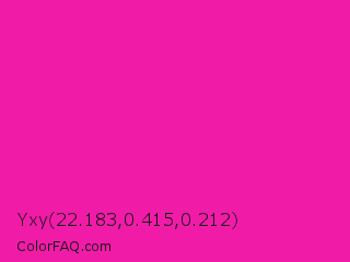 Yxy 22.183,0.415,0.212 Color is a normal magenta color and the nearest color is Persian Rose #fe28a2. Hex code #f01ca8 and RGB value is rgb(240,28,168). In RGB color space, this color is composed of 94% red, 11% green, 66% blue, In CMYK color space, this color is composed of 0% cyan, 88% magenta, 30% yellow , 6% black , In HSL color space, this color has a hue angle of 320° , 88% saturation and 53% lightness.