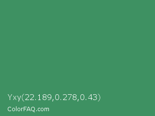 Yxy 22.189,0.278,0.43 Color is a normal green color and the nearest color is Viridian #40826d. Hex code #3e9162 and RGB value is rgb(62,145,98). In RGB color space, this color is composed of 24% red, 57% green, 38% blue, In CMYK color space, this color is composed of 57% cyan, 0% magenta, 32% yellow , 43% black , In HSL color space, this color has a hue angle of 146° , 40% saturation and 41% lightness.